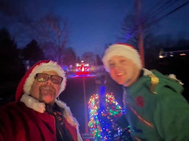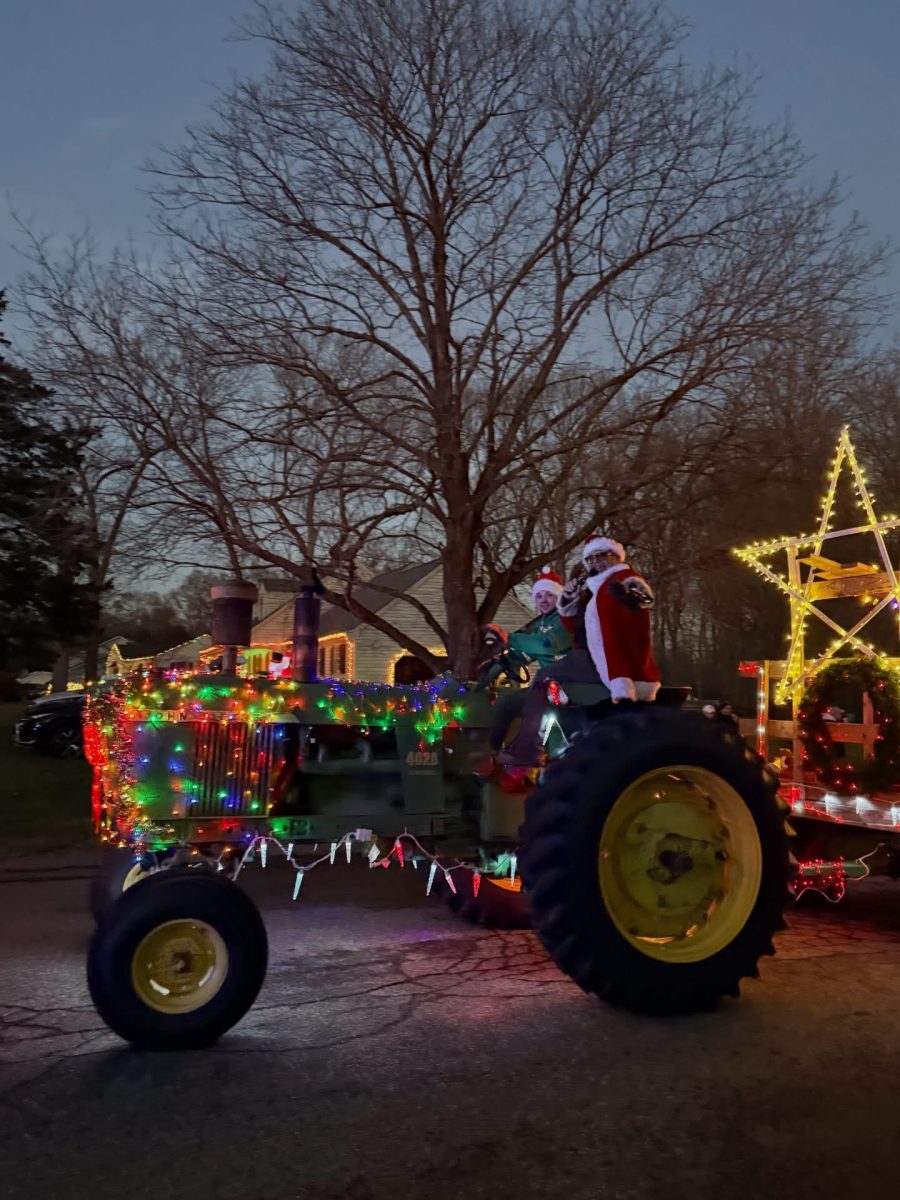 2022 – 65 Tractors! WOW! The new route is working well, we met again at Fred Wolf Park. With our Assistant Chief of the OPD leading us, we drove down Meetinghouse Lane, did our slow parade route in front of the green before the Tree Lighting, then headed to fairgrounds. We parked on fairgrounds for an hour for anyone who wanted to view the decorated tractors while enjoying hot chocolate and cider. (The weather was perfect! 😊)